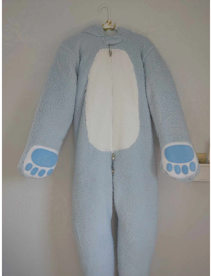 This is an adult custom-sized locking bear footie suit. It will have a solid head (solid eye holes, perforated vinyl nose), and a locking zipper running from the back of the head, down the body, to the crotch, and slightly up the lower front of the pajama. There will be 2 locking zipper heads so you can open the bottom of the pajama, while keeping the rest of it on. The sleeves are fully enclosed, with padded mittens at the ends. ***This will have a special add on locking zipper across the mouth. The wrists will also have locking zippers in them.