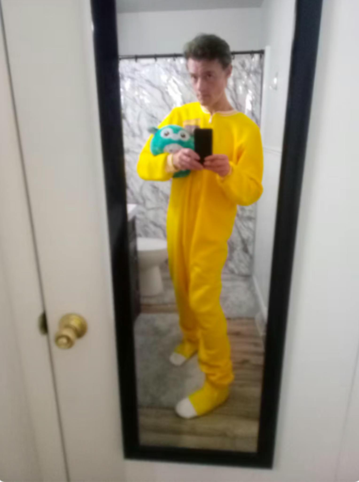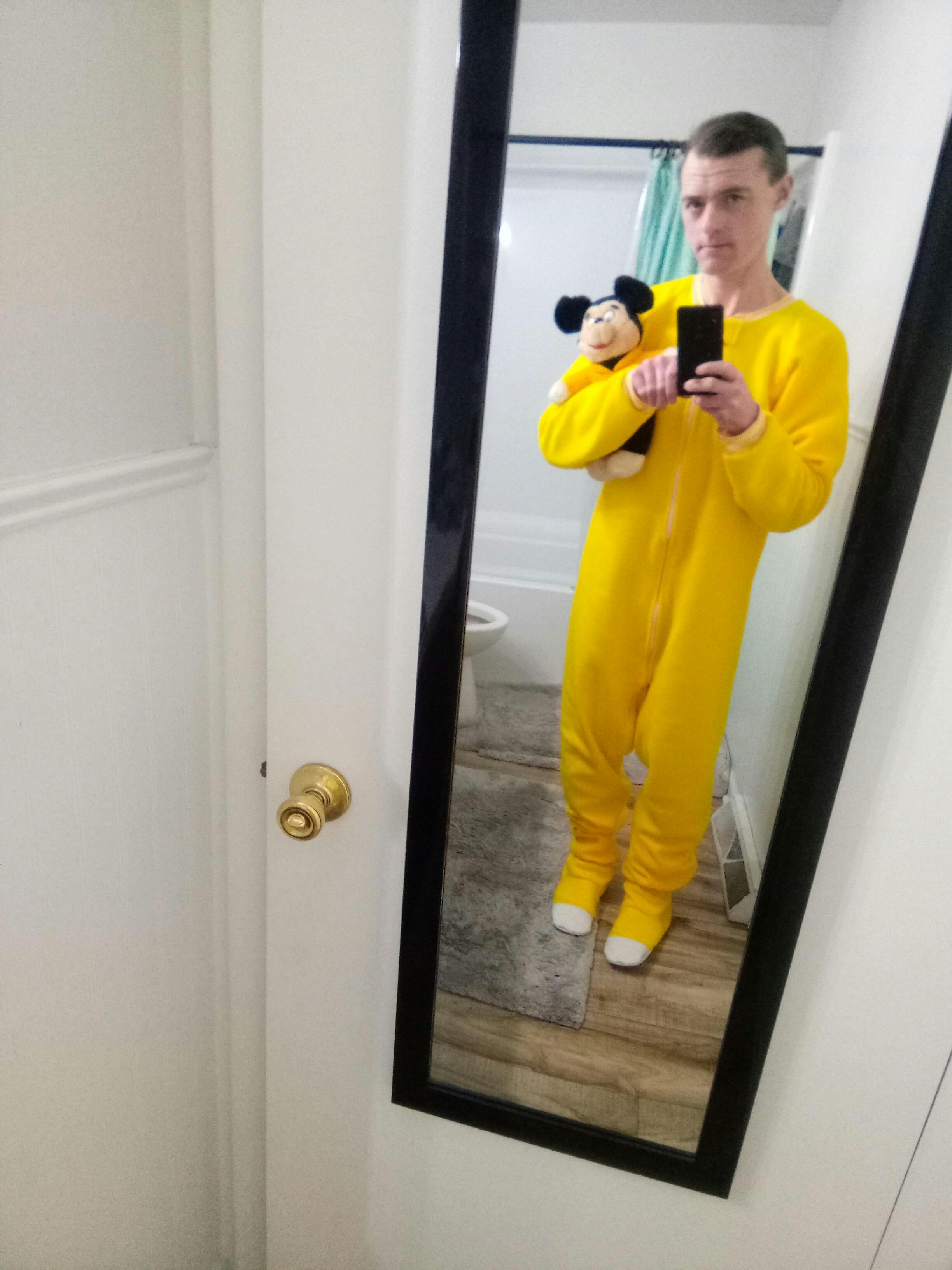 This is for a custom bright yellow fleece footie made just for you! It will feature a locking zipper from neck to ankle, elastic in the ankles, vinyl soles, and vinyl toe caps. The fleece is a blizzard fleece, so is a nice medium weight that won't be too warm for these upcoming spring days (and nights!)